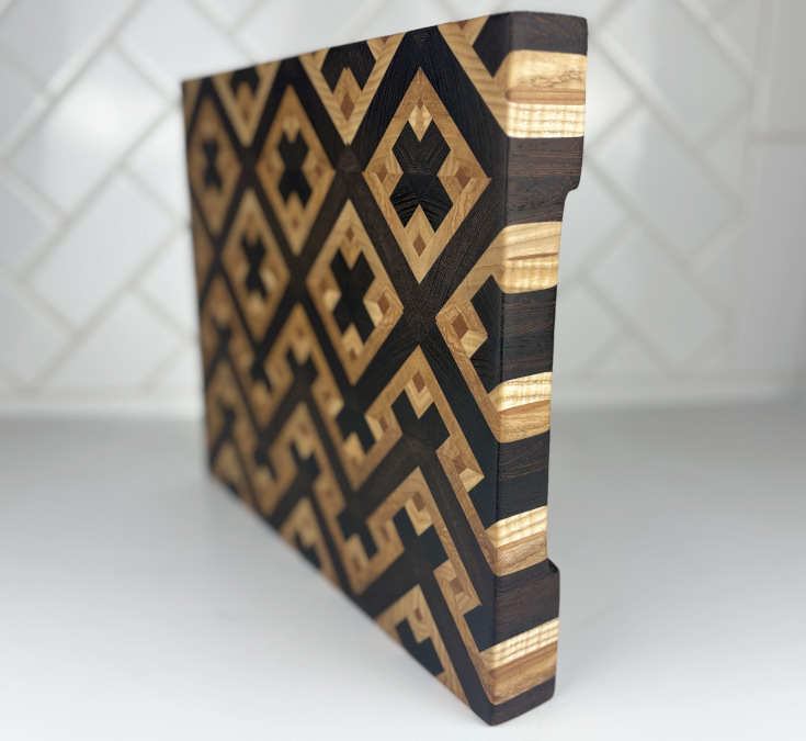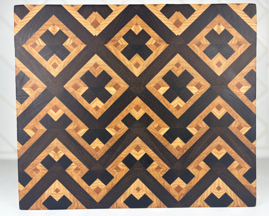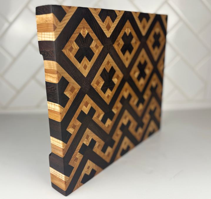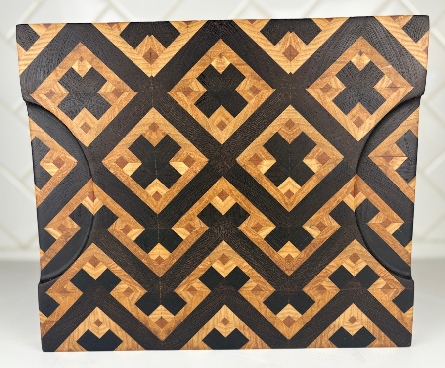 This 14 ½” x 12 ½” x 1 ¾” end grain cutting board is a showcase of precision craftsmanship and bold design. Made from rich wenge, pale ash, and warm cherry, the hardwoods are arranged in a striking 3D weave pattern that creates the illusion of interlacing blocks. The intricate end grain layout not only adds visual depth but also provides exceptional durability and a knife-friendly surface.