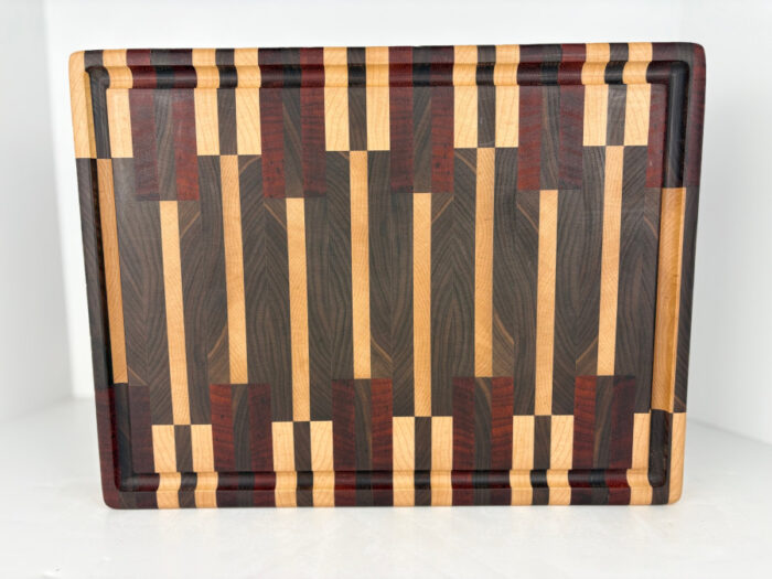This handcrafted end grain cutting board is made from a rich combination of walnut, maple, and padauk hardwoods, arranged in a striking alternating striped pattern. Measuring 15 ½” x 11 ¾” x 2″, its thick and durable end grain construction provides a knife-friendly surface with natural self-healing properties, making it ideal for both meal prep and serving.