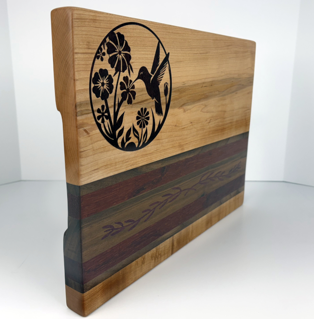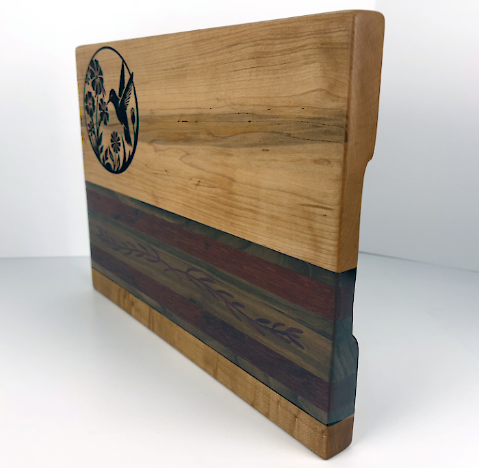 In the top left corner, a beautifully detailed hummingbird scene—also inlaid with padauk—adds a vibrant, nature-inspired focal point that sets this board apart.