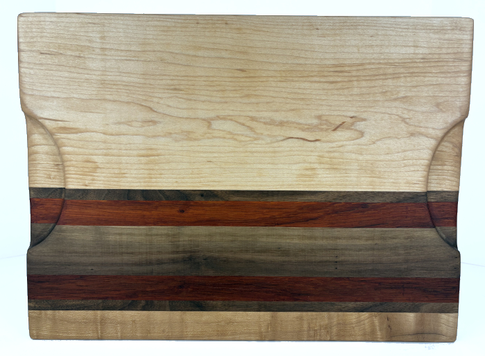 This one-of-a-kind cutting board is as functional as it is artistic. Handcrafted from face grain maple and curly maple, it features a bold walnut and padauk stripe running across the bottom half, accented with a graceful vine inlay made from rich purpleheart hardwood.